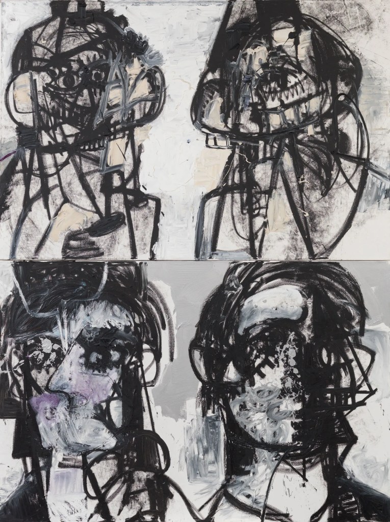 Tout au long du parcours, la figure chez Condo est régulièrement mise à mal. Soit complètement effacée, notamment dans The Portable Artist (1995, coll. part), soit défigurée dans The Letter (2010, coll. part si mes notes sont exactes), soit enfin complètement fondue et réduite à l’ordre de l’indice dans les Compression Painting. Il en va de même dans ces dessins où Condo, noircissant des pages de carnets entiers, fait grimacer des figures enlaidies par un maillage de traits, créant textures et reliefs.